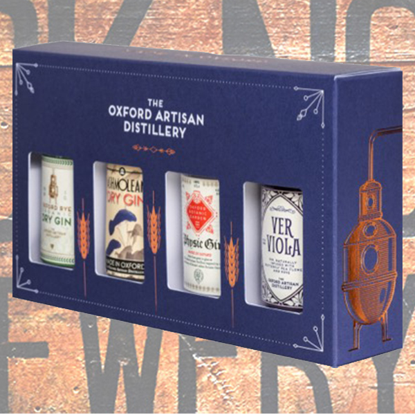 4x 5cl bottles. Four different artisan gins and vodka distilled by the oxford artisan distillery.